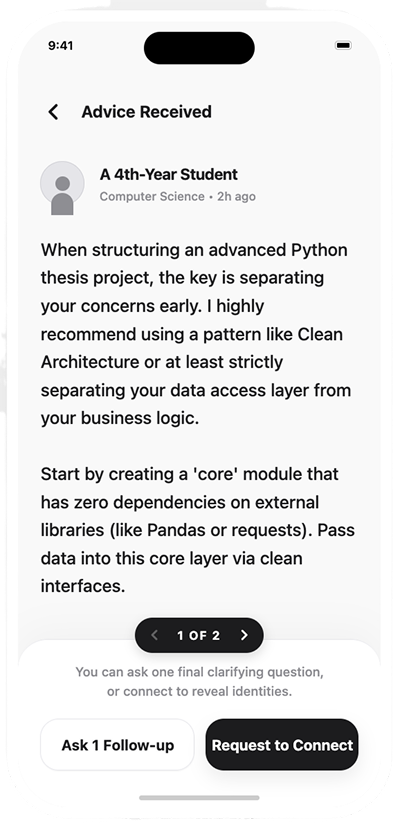 Yes. Questions are asked anonymously, allowing people to seek guidance without fear of judgment. While identities remain private to the broader network, the platform maintains internal accountability to ensure respectful and helpful interactions.